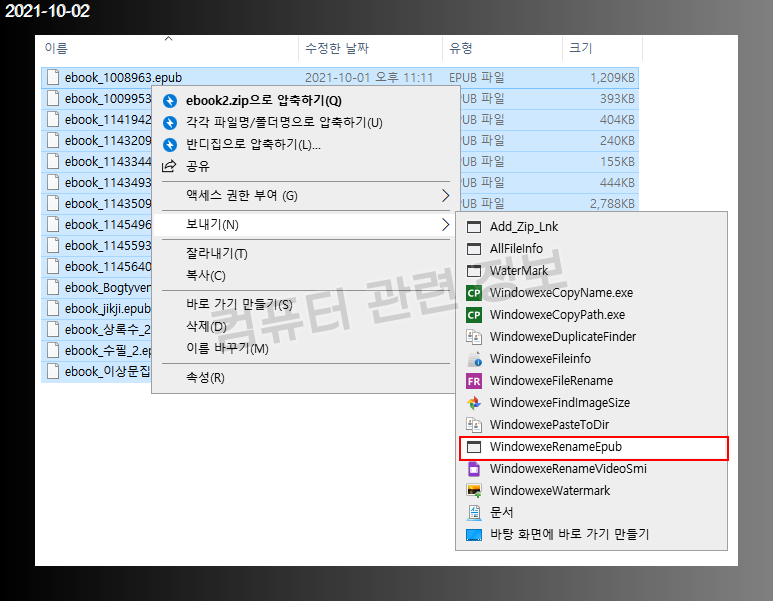탐색기에서 이름을 바꾸고자 하는 이북파일(Epub)을 선택하고 마우스 우클릭 - 보내기 - WindowexeRenameEpub 을 클릭하세요.