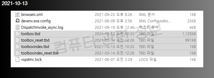 설정을 초기화해도 안되고, 툴박스를 리셋해도 안되고 구글에서 검색해보니 비쥬얼 스튜디오 설정 폴더에서 .tbd 파일을 모두 삭제하라고 하더군요.