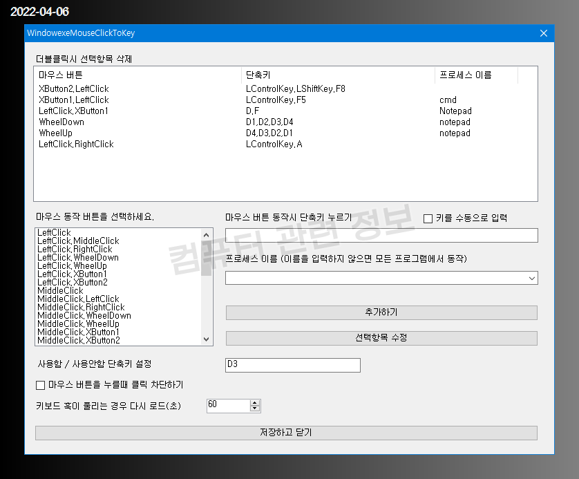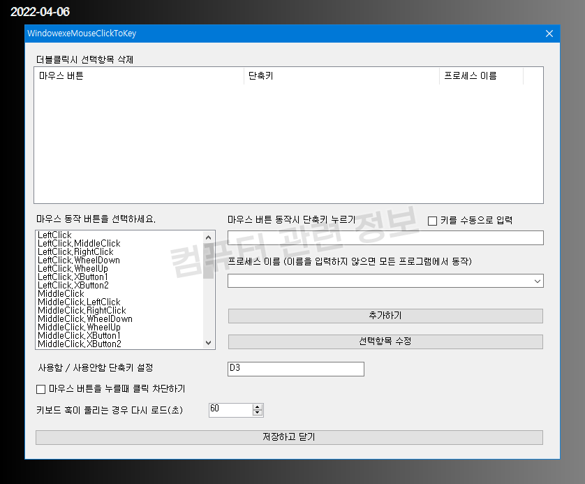 프로세스 이름을 공백으로 두게 되면 모든 프로그램에서 적용이 되고 프로세스의 이름을 쓰고 추가하면 그 프로그램내에서만 단축키가 동작합니다.