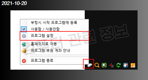 작업표시줄 오른쪽 시스템 트레이 아이콘에 마우스 모양의 아이콘이 생기는데 마우스 우클릭해서 설정을 누르세요.