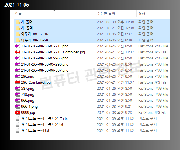 윈도우 탐색기를 사용하면서 폴더나 파일이 많이 있을 때 폴더만 모두 선택하려면 시프트키를 사용해서 첫번째 폴더를 선택하고 마지막 폴더를 선택후 클릭해야 됩니다.