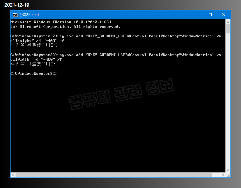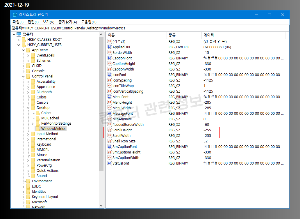 저는 -350으로 수정했습니다. 레지스트리 편집기는 종료하고 재부팅하면 스크롤바의 크기가 변경됩니다.