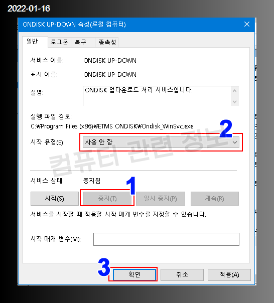 서비스를 사용안함으로 설정하는 명령어입니다. (위에 있는 서비스를 사용안함으로 설정하는 작업과 동일)