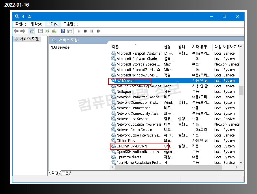 NATService 서비스를 더블클릭해서 중지 클릭, 사용안함 클릭, 확인을 순서대로 클릭하세요.