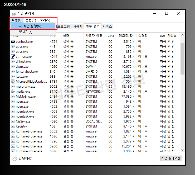 작업관리자 실행화면 입니다. [승격됨]을 보면 [아니요]로 되어 있습니다.