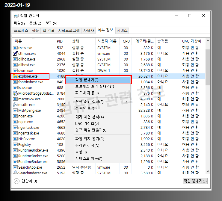 작업표시줄 및 윈도우 탐색기 프로그램은 기본적으로 일반 사용자 권한으로 실행이 되는데요.