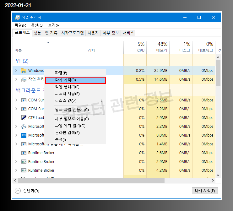 재부팅없이 즉시 적용을 하려면 작업관리자를 실행해서 윈도우 탐색기 프로세스를 강제 종료후 다시 실행하면 됩니다.