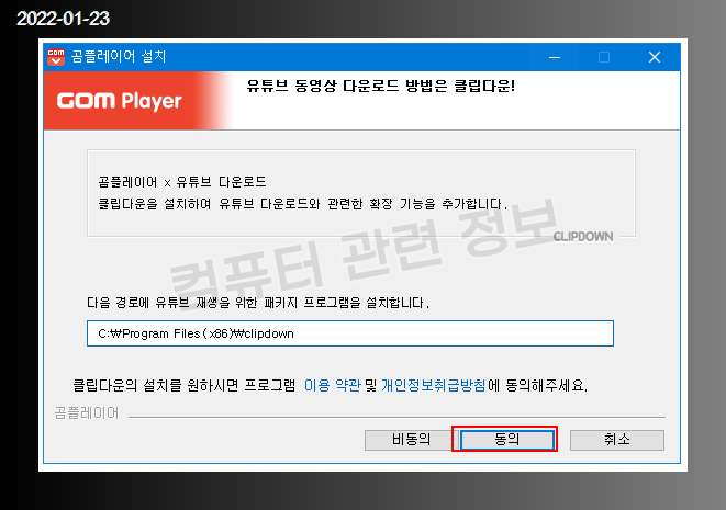 유튜브 동영상 다운로더 클립다운도 추가로 설치됩니다. 비동의가 맞지만 동의하고 넘어가겠습니다.