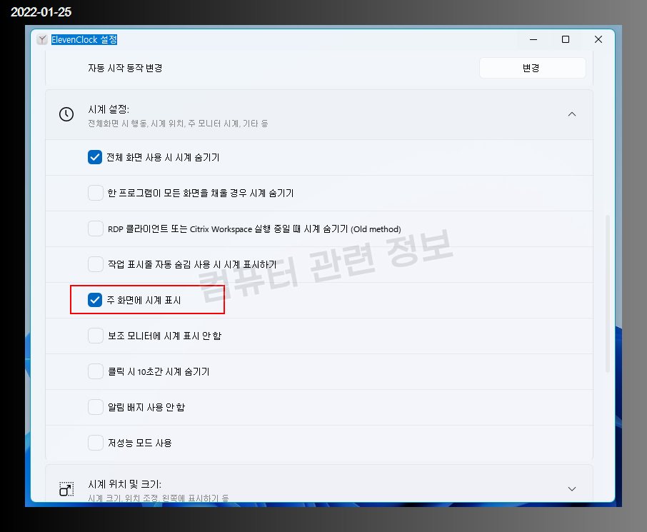 시계 설정에서 주 화면에 시계표시를 클릭하세요.