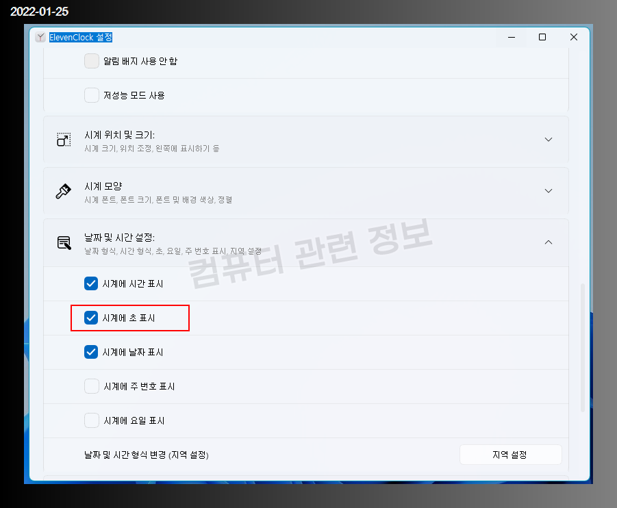 윈도우 10에서는 프로그램을 사용하지 않고 레지스트리를 수정하면 초단위 표시가 가능했는데 윈도우 11에서는 그 기능이 없어졌습니다.