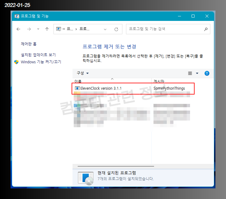 프로그램의 삭제는 제어판 - 프로그램 추가/제거에서 ElevenClock 를 더블클릭하면 삭제가 시작됩니다.