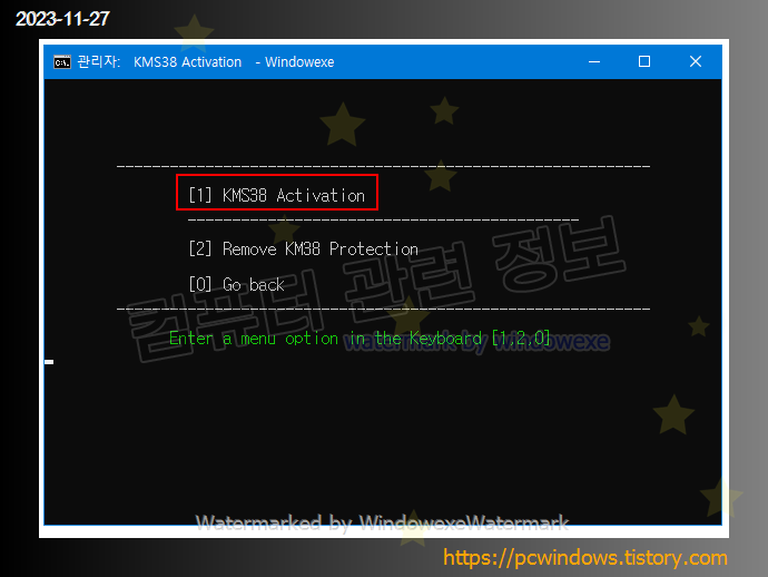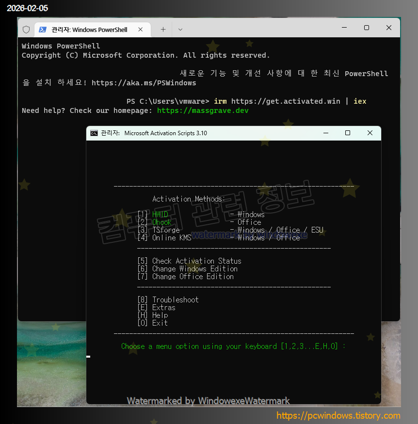 위에 올린 파일을 다운로드 받아서 압축을 풀고 MAS_AIO.cmd 파일을 관리자 권한으로 실행하세요.