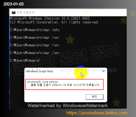 제가 테스트한 컴퓨터에서 인증을 확인해보면 영구인증으로 나옵니다. slmgr /xpr