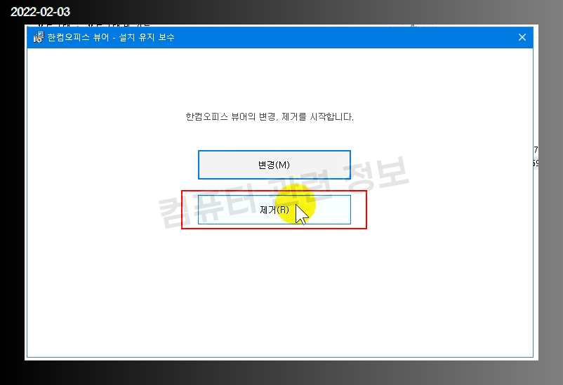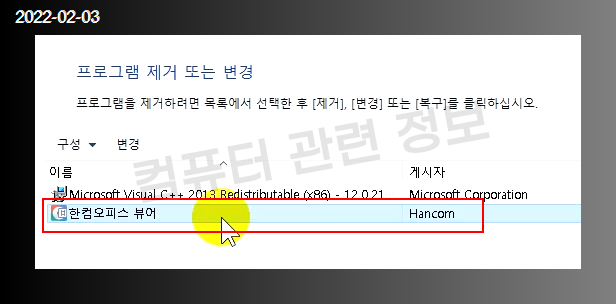 설치한 프로그램의 제거는 제어판 - 프로그램 제거 또는 변경에서 [한컴오피스 뷰어]를 더블클릭하면 됩니다.