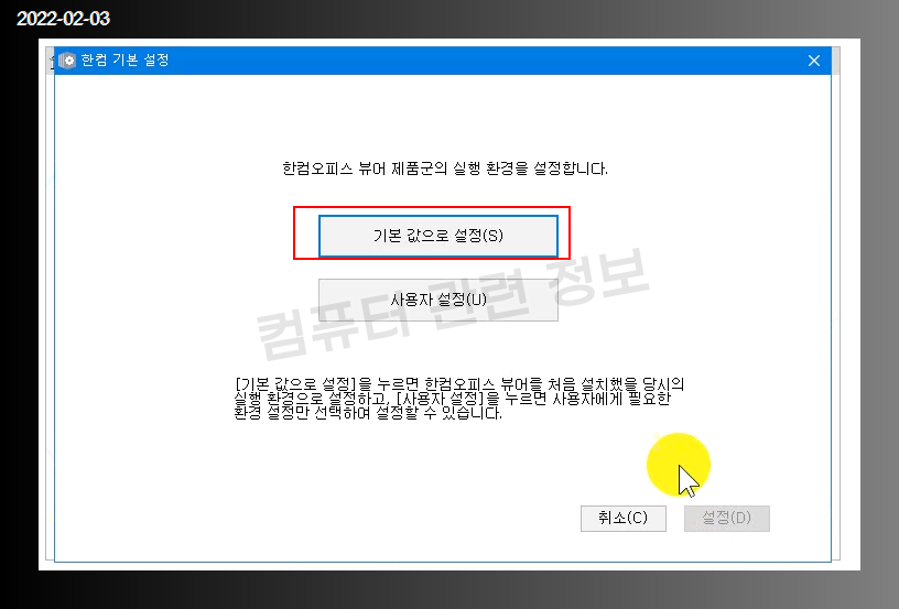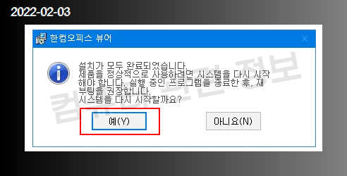 컴퓨터를 다시 시작할건지 물어보는데 예를 클릭하세요. 아니요를 클릭해도 한글 문서는 바로 열리더군요.