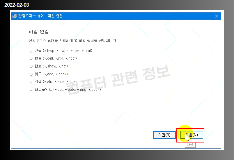 문서파일을 연결한 항목을 선택하세요. 기본값으로 두면 됩니다. 다음클릭.