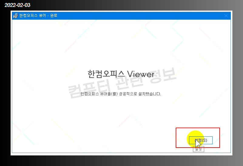 프로그램 설치가 완료되었습니다. 설정을 클릭.