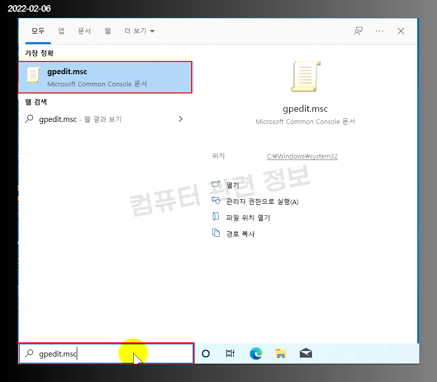 검색에서 gpedit.msc 를 검색하면 아무것도 나오지 않습니다.