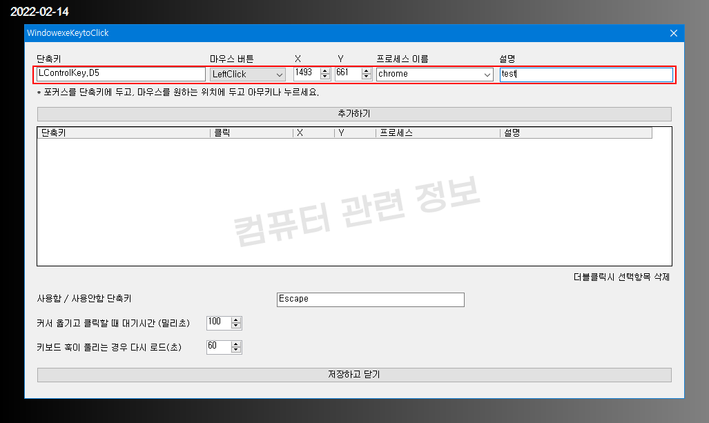 프로세스 이름을 적는 부분이 있는데요. 사용자가 지정한 프로그램마다 단축키와 좌표를 개별적으로 설정할 수 있습니다.