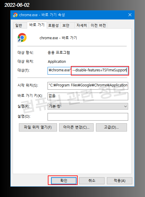 그래도 해결이 안되는 경우 크롬 바로가기의 속성을 여세요.