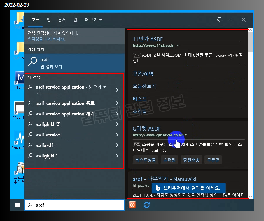 윈도우 11 또는 윈도우 10 작업표시줄에서 검색을 할 때 빙 추천 검색어가 뜨고 오른쪽에 웹 검색도 같이 뜹니다.