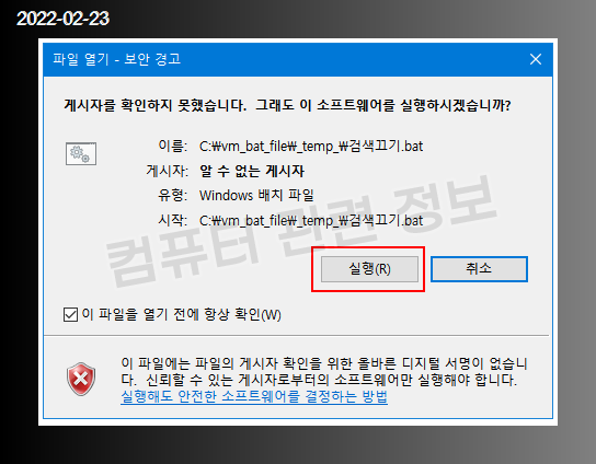 보안 경고 메세지가 뜨면 실행을 클릭하세요.