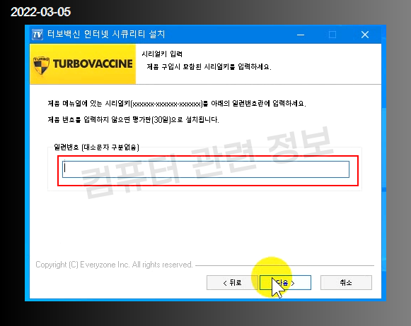 제품 번호를 입력하는 화면이 나오는데 그냥 다음을 누르면 체험판 버전으로 설치됩니다.