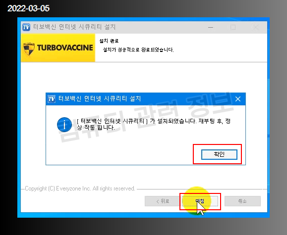 프로그램 설치가 완료되었습니다. 재부팅을 해야 정상 작동한다고 나옵니다. 확인을 클릭하세요.