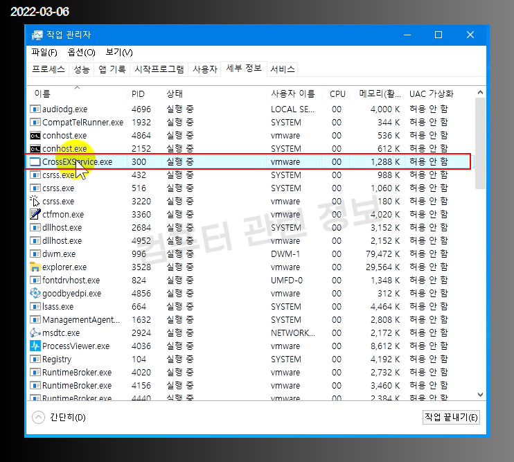 작업관리자를 실행해보면 CrossEXService.exe 프로세스가 실행이 되고 있는걸 확인할 수 있습니다.