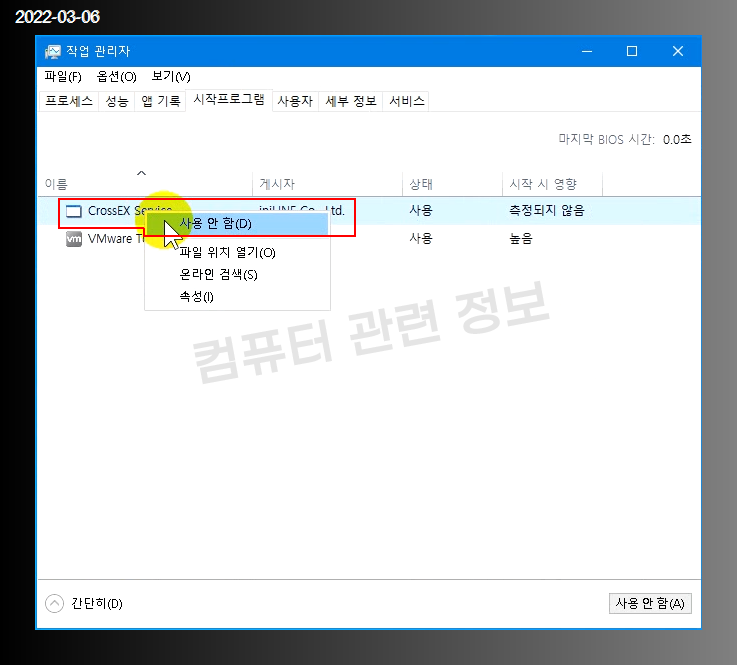 CrossEX Service 를 마우스 우클릭하고 사용안함을 클릭하면 됩니다.