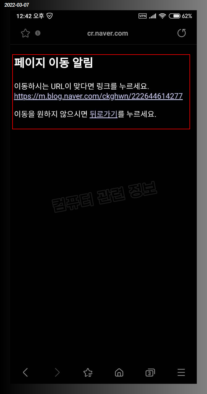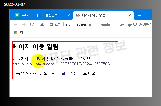 네이버에서 검색을 하고 링크를 클릭할 때 페이지 이동 알림 이라는 메세지가 나오는데요. 이 메세지가 나오지 않도록 설정해보겠습니다.