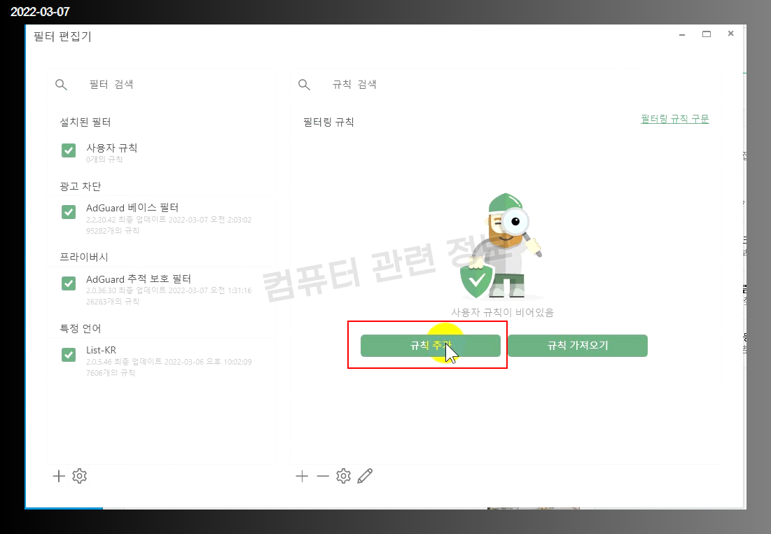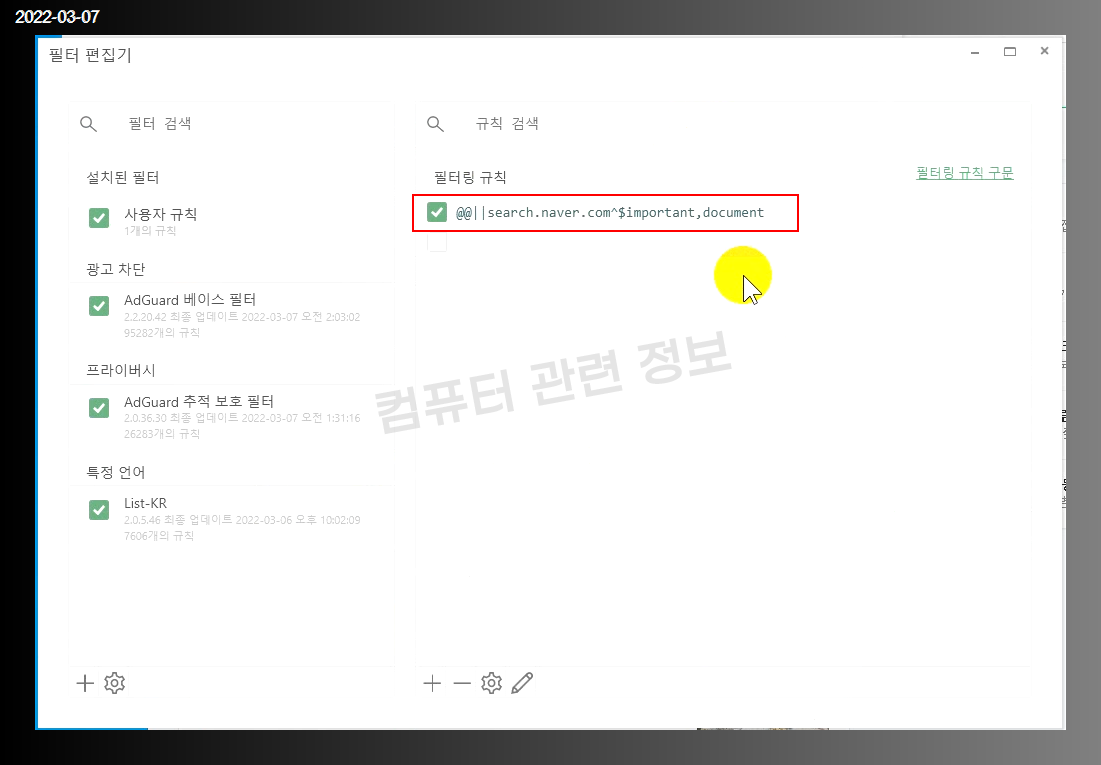 엔터를 치면 필터가 활성화됩니다. 그리고 애드가드 창은 닫으면 됩니다.