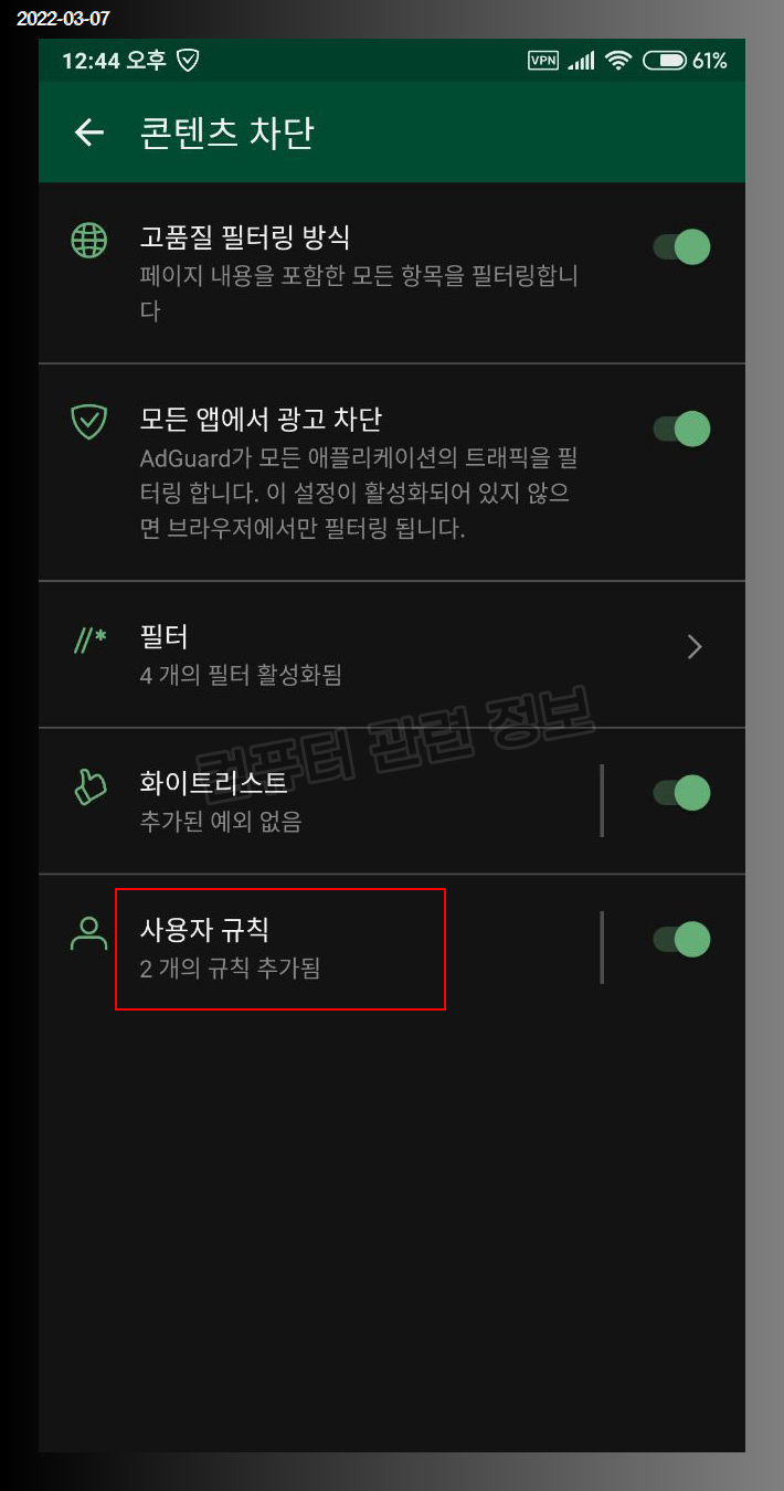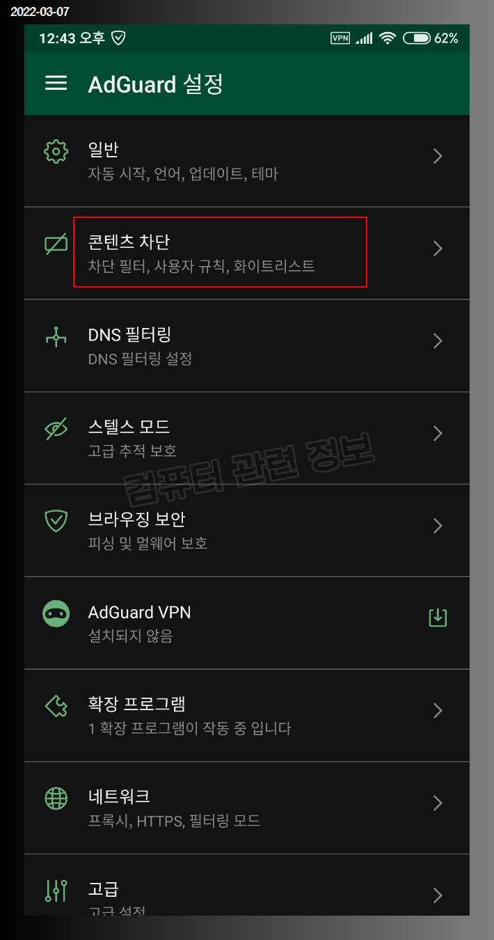 애드가드로 들어가서 설정클릭(?). 터치.