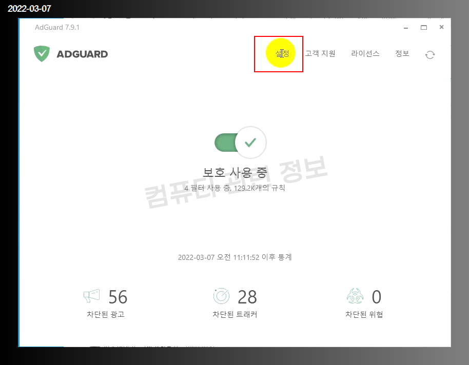 애드가드 메인화면에서 설정을 클릭하세요.