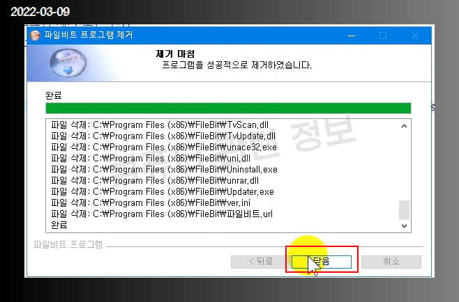 프로그램이 삭제되었습니다. 닫음 클릭.