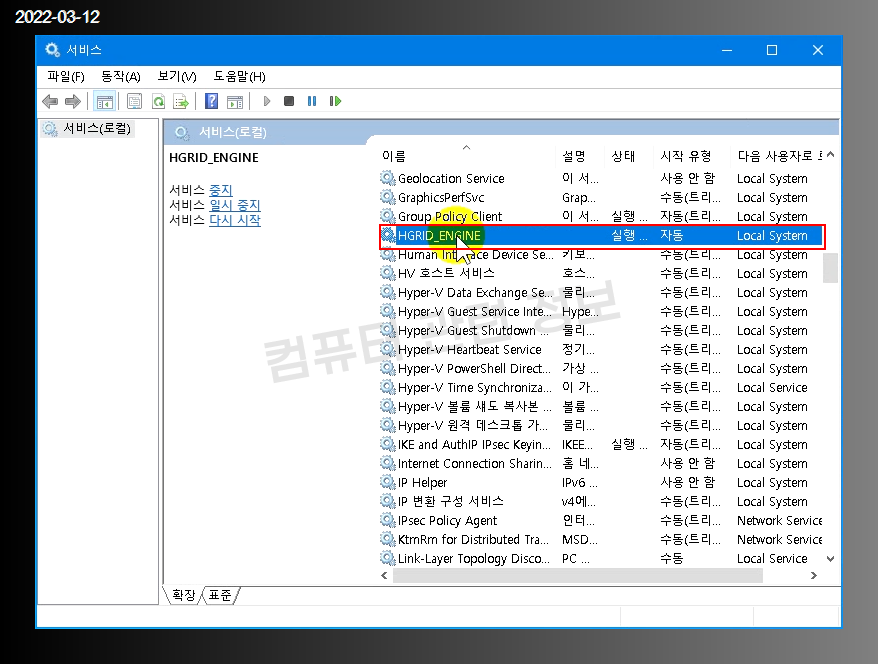 컴퓨터에 설치된 서비스가 상당히 많은데요. 이중에서 HGRID_ENGINE 을 찾아서 더블클릭하세요.