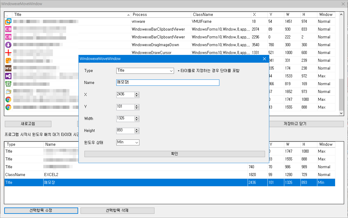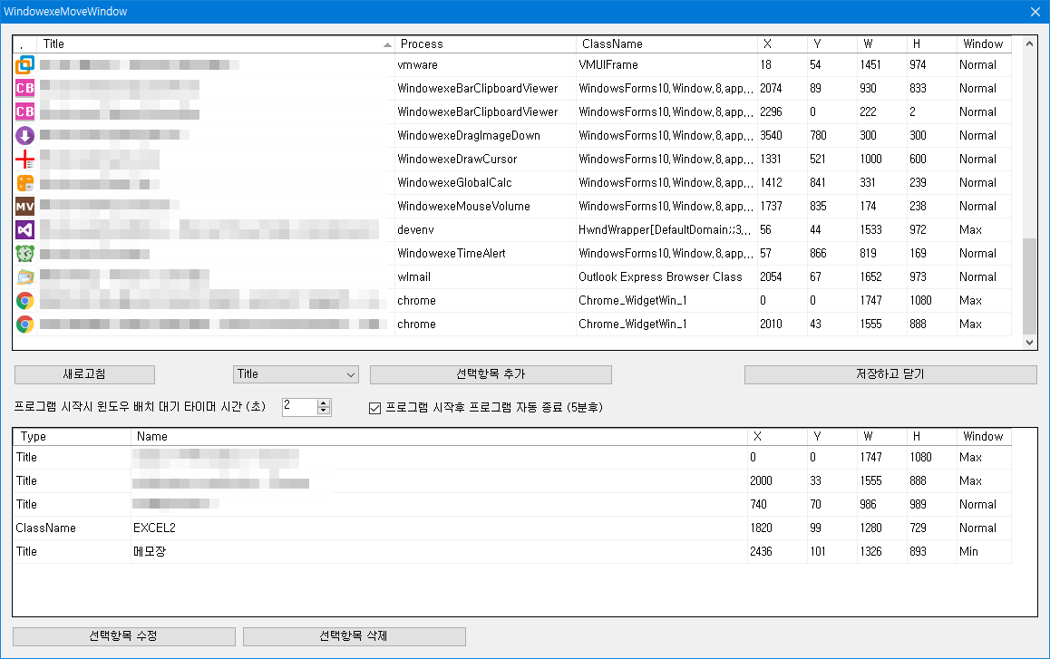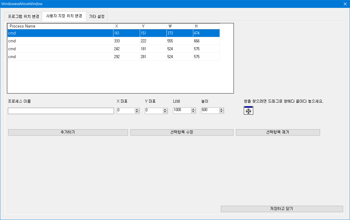 * 프로세스 이름, 클래스 이름, 타이틀이 모두 동일한 경우는 프로그램을 각각 옮기기 어려워서 사용자 지정 위치 변경 기능이 추가되었습니다.