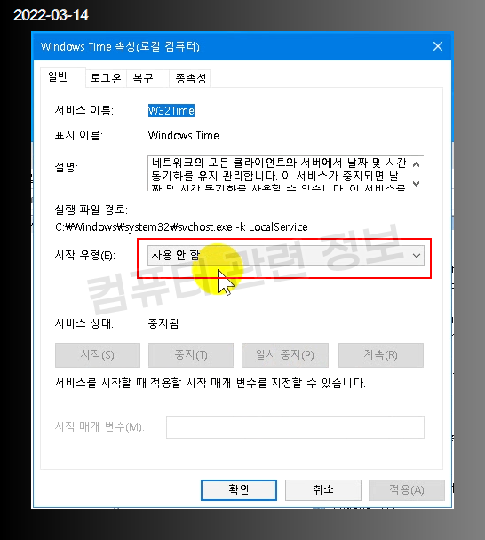 그리고 서비스 시작 유형이 사용안함으로 자동 설정됩니다.