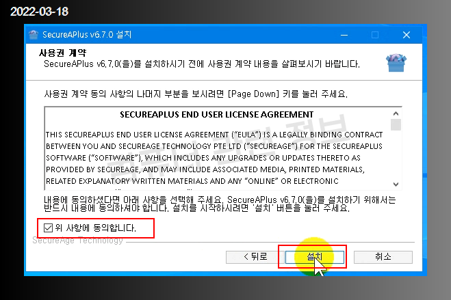 프로그램 설치 마법사가 나오는데 사용권 계약 동의에 체크, 설치 클릭.