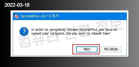 시스템을 재부팅할건지 물어봅니다. 예를 클릭하세요.