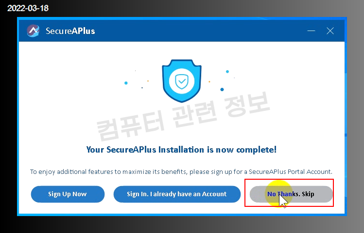 회원가입 관련 메세지가 나오는데 필요없으므로, No Thanks. Skip 을 누르세요.