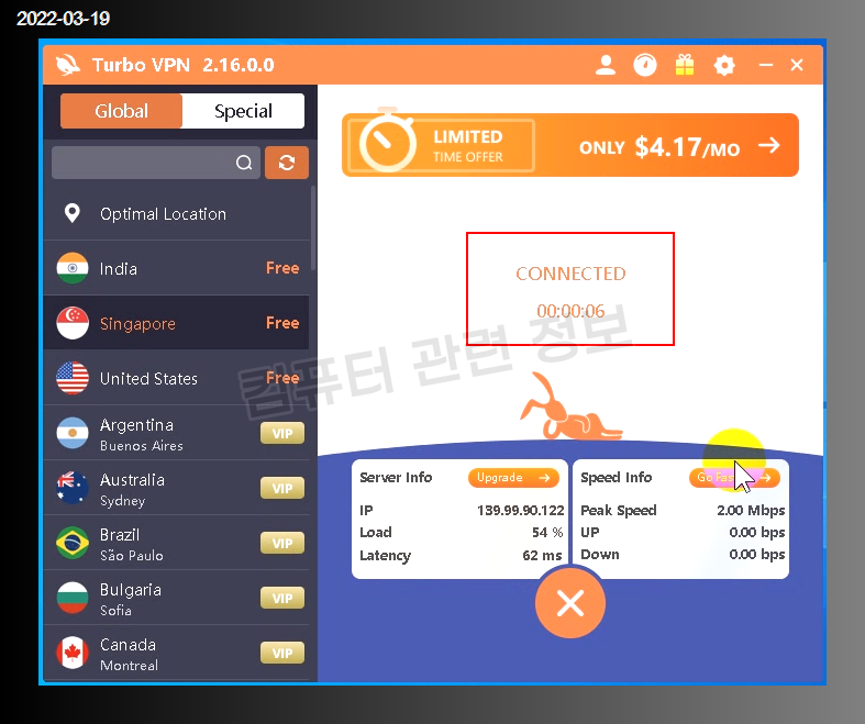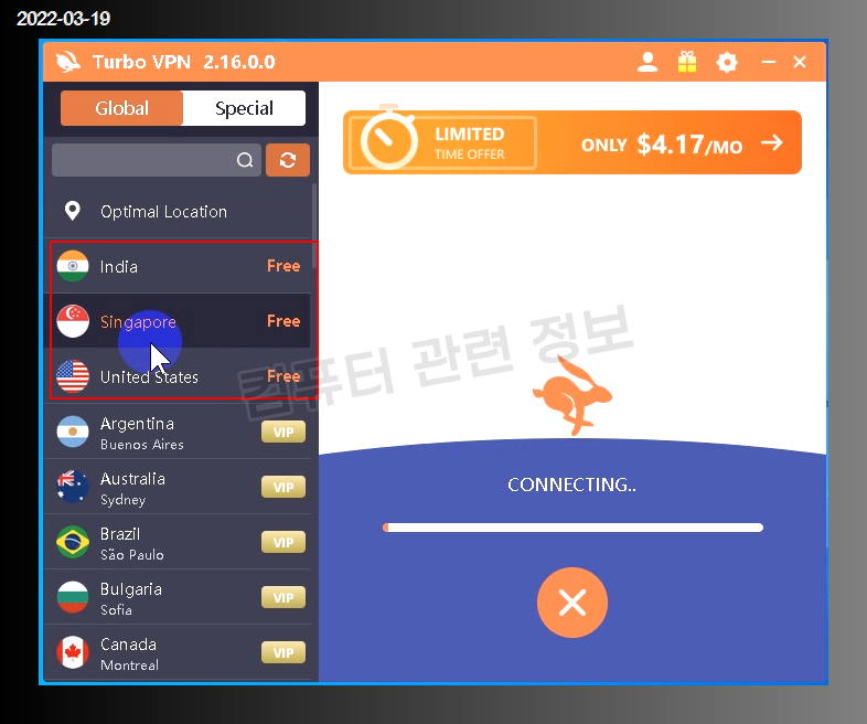 무료버전은 접속가능한 국가가 몇개 안되고 인터넷 속도도 많이 느립니다.