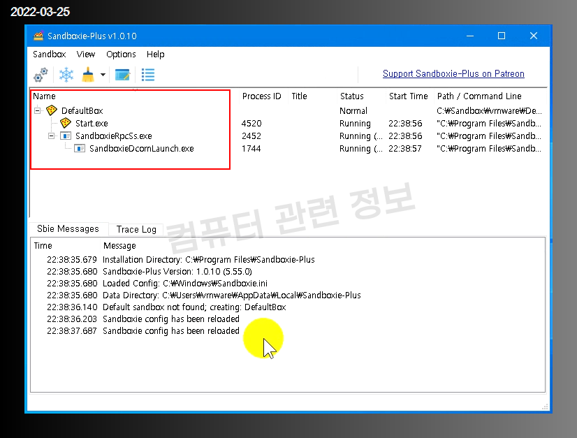 샌드박시 화면에서 선택한 파일의 프로세스가 실행되고 메인 화면에 프로세스가 표시됩니다.