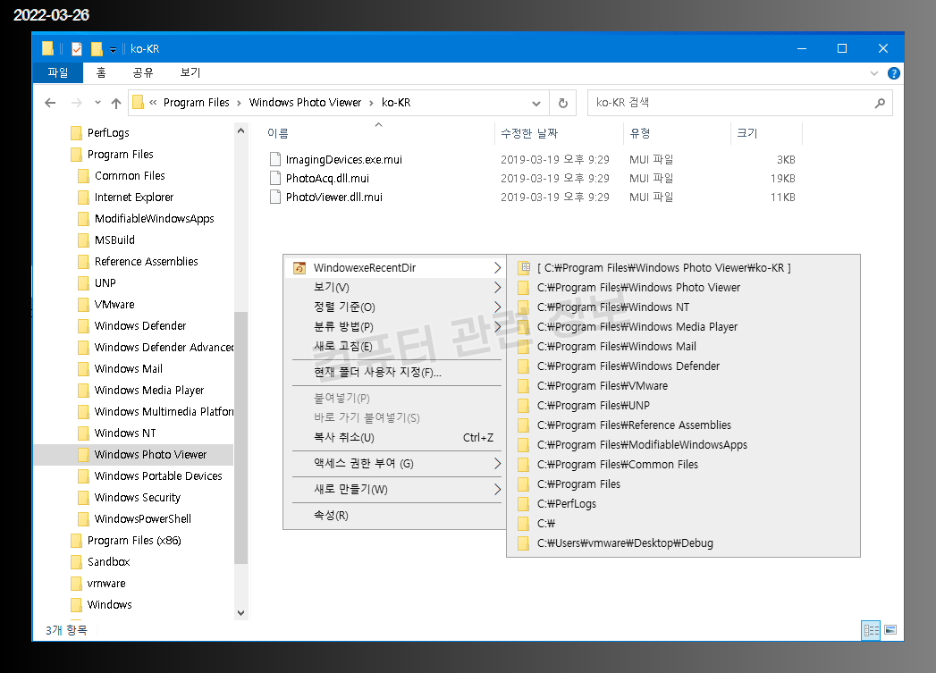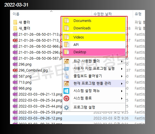 최근 사용한 폴더 메뉴의 하위 메뉴입니다. 여기에 있는 폴더는 윈도우 탐색기에서 폴더를 열때마다 자동으로 최근 사용한 폴더에 추가됩니다.