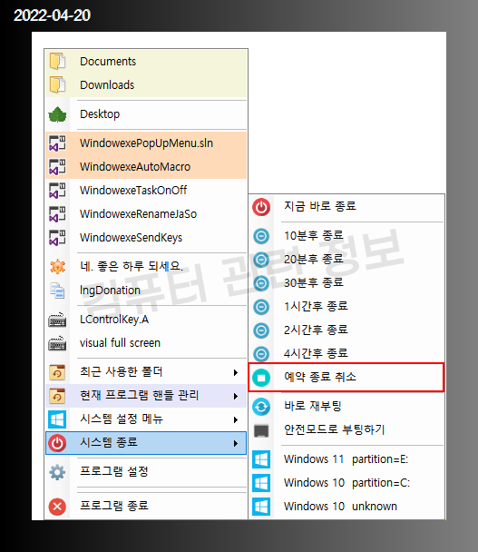 이 외에도 현재 활성화된 창관리(항상위, 투명도 설정, 프로그램 예약 종료), 시스템 종료 관련 메뉴가 있습니다.