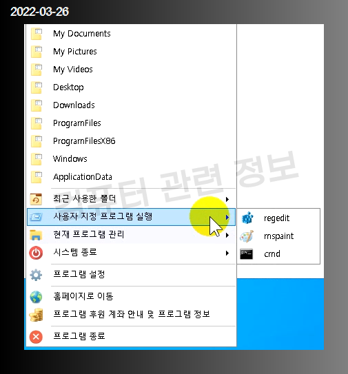 위 스크린샷의 프로그램 메뉴중 밑에 있는 세개의 메뉴는 시스템 트레이의 메뉴로 옮겼습니다.