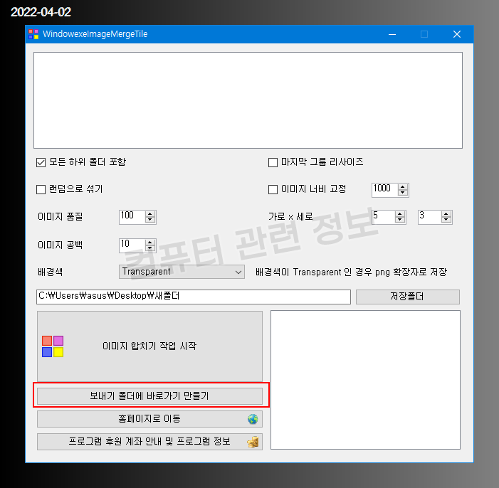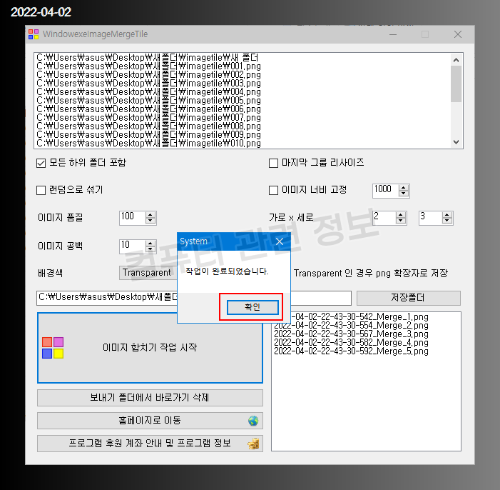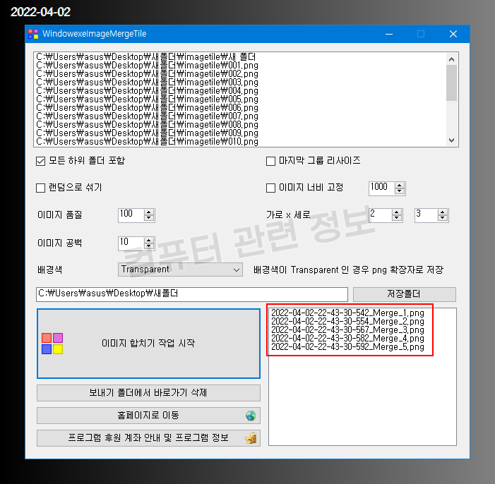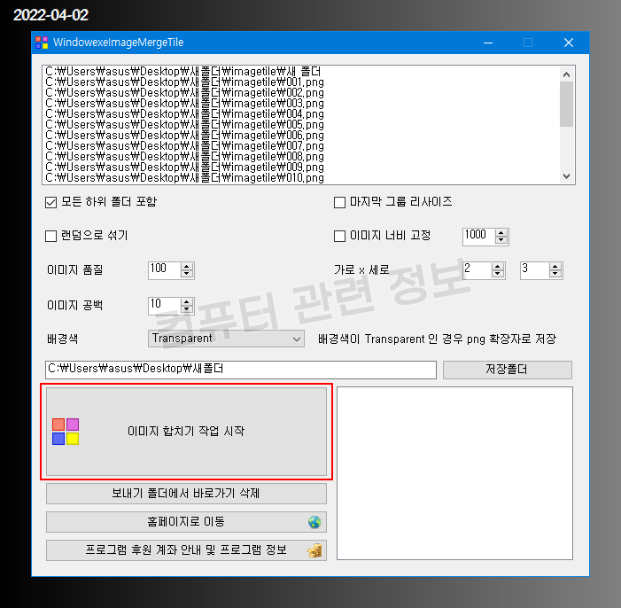 이 프로그램에서 바둑판 병합기능을 따로 빼서 지정한 파일수 만큼만 이미지를 합칠수 있도록 프로그램을 새로 만들었습니다.