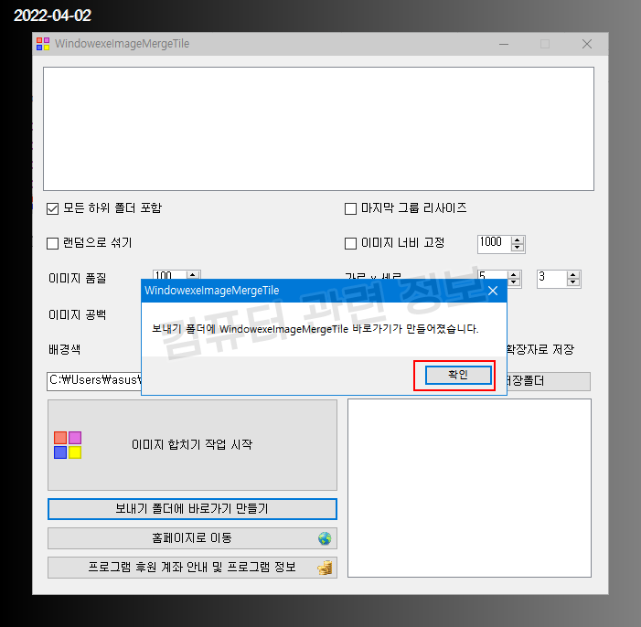 파일명은 변경하지 마세요. WindowexeImageMergeTile 이 아니면 실행이 되지 않습니다.