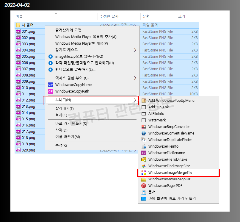 윈도우 탐색기를 열고 합치고자 하는 폴더나 파일을 선택하고 마우스 우클릭, 보내기 - WindowexeImageMergeTile 를 클릭하세요.