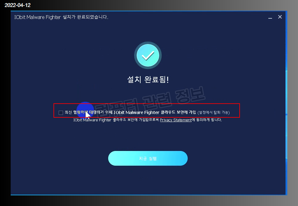 설치가 완료되었습니다. 클라우드 보안에 가입할건지 물어보는데 체크해제하세요.
